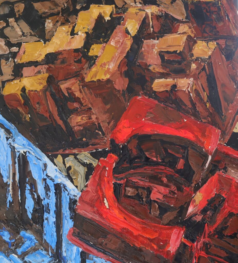 Pylore rouge et vermillon, noir, rouge et brun transparent de Mars, ocre jaune et terre de Cassel, bleu de cobalt et touches de blanc de titane.